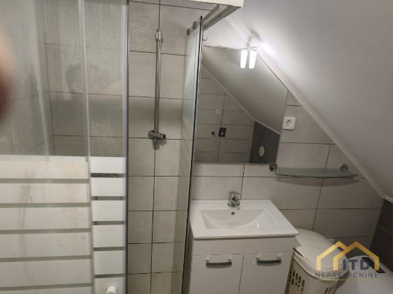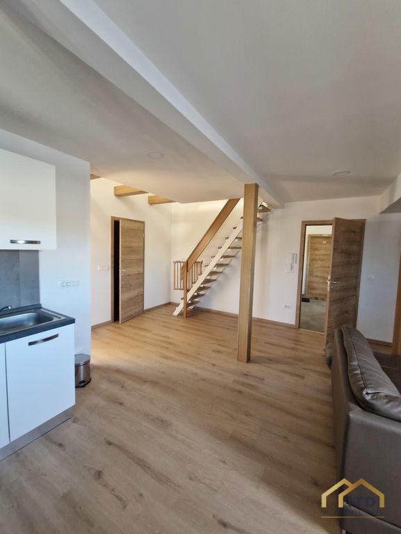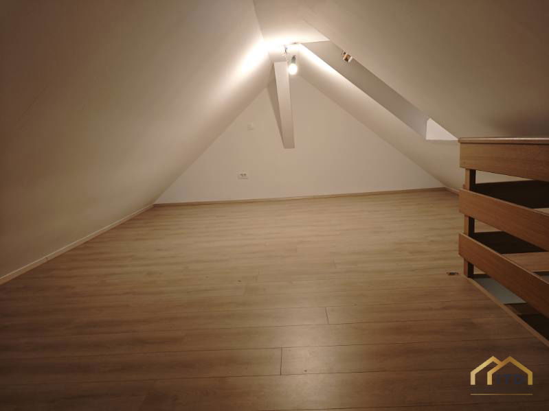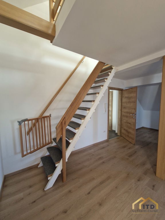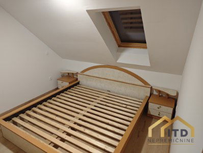 Stanovanje zajema dnevni prostor s kuhinjo in jedilnico, spalnico, večjo podstrešno sobo in kopalnico.