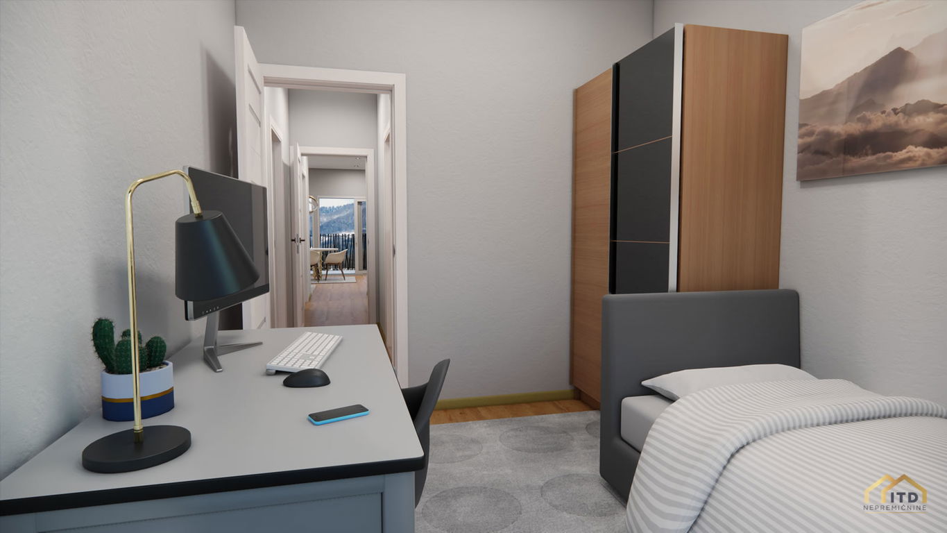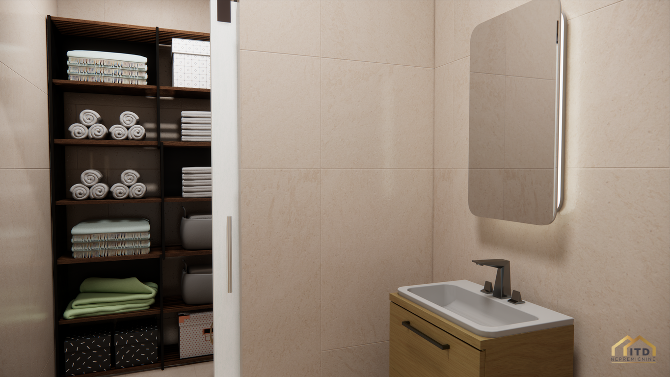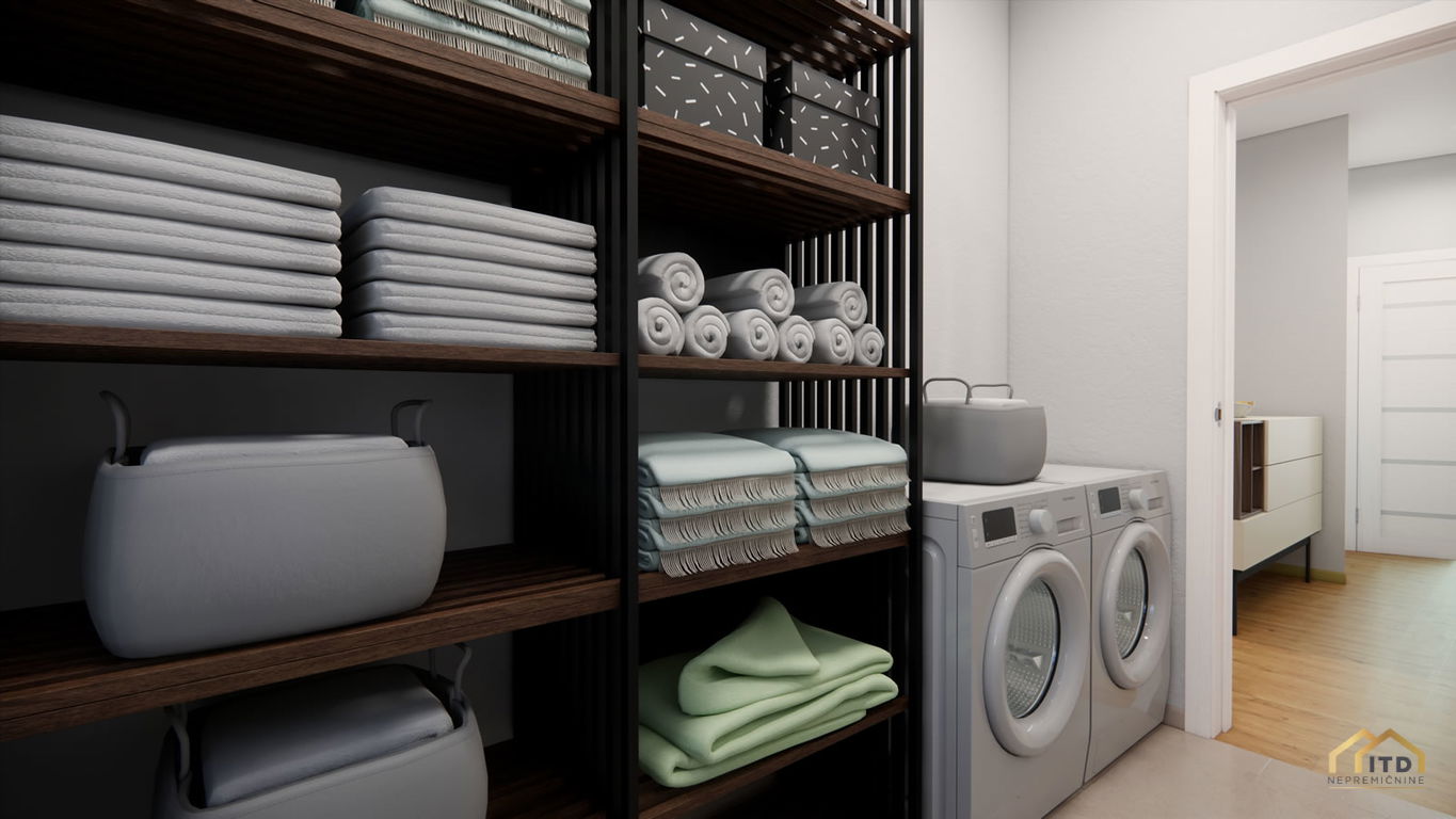 predsoba, ločen wc, prostorom za pralni in sušilni stroj (utility), dnevno-bivalni del s kuhinjo in jedilnico ter izhodom na teraso, spalnica, 2x otroška soba (obe) z izhodom na balkon, kopalnica s tuš kabino. Stanovanje je orientirano na zahod z odprtim pogledom na Šmarjetno goro in okolico.