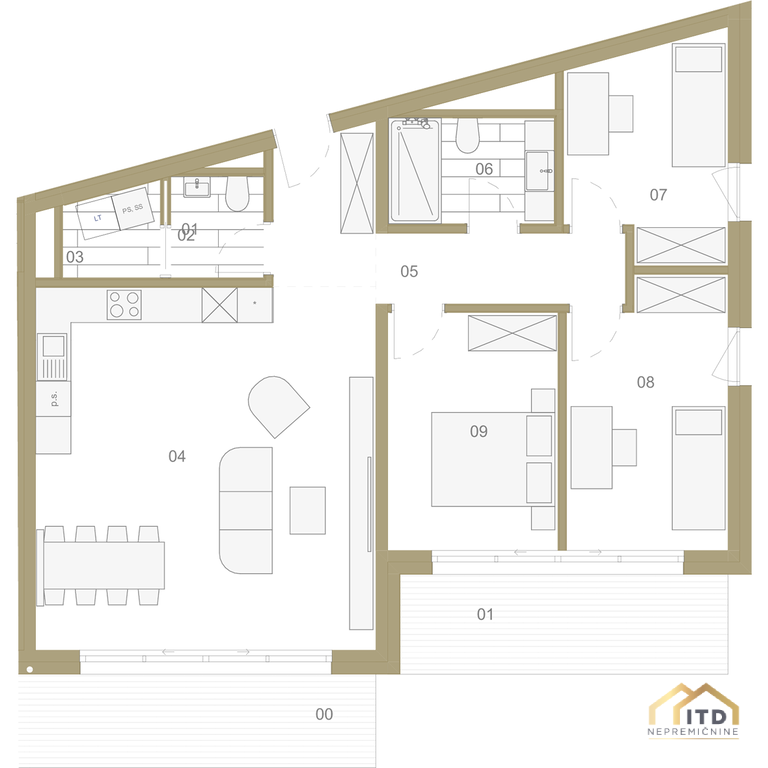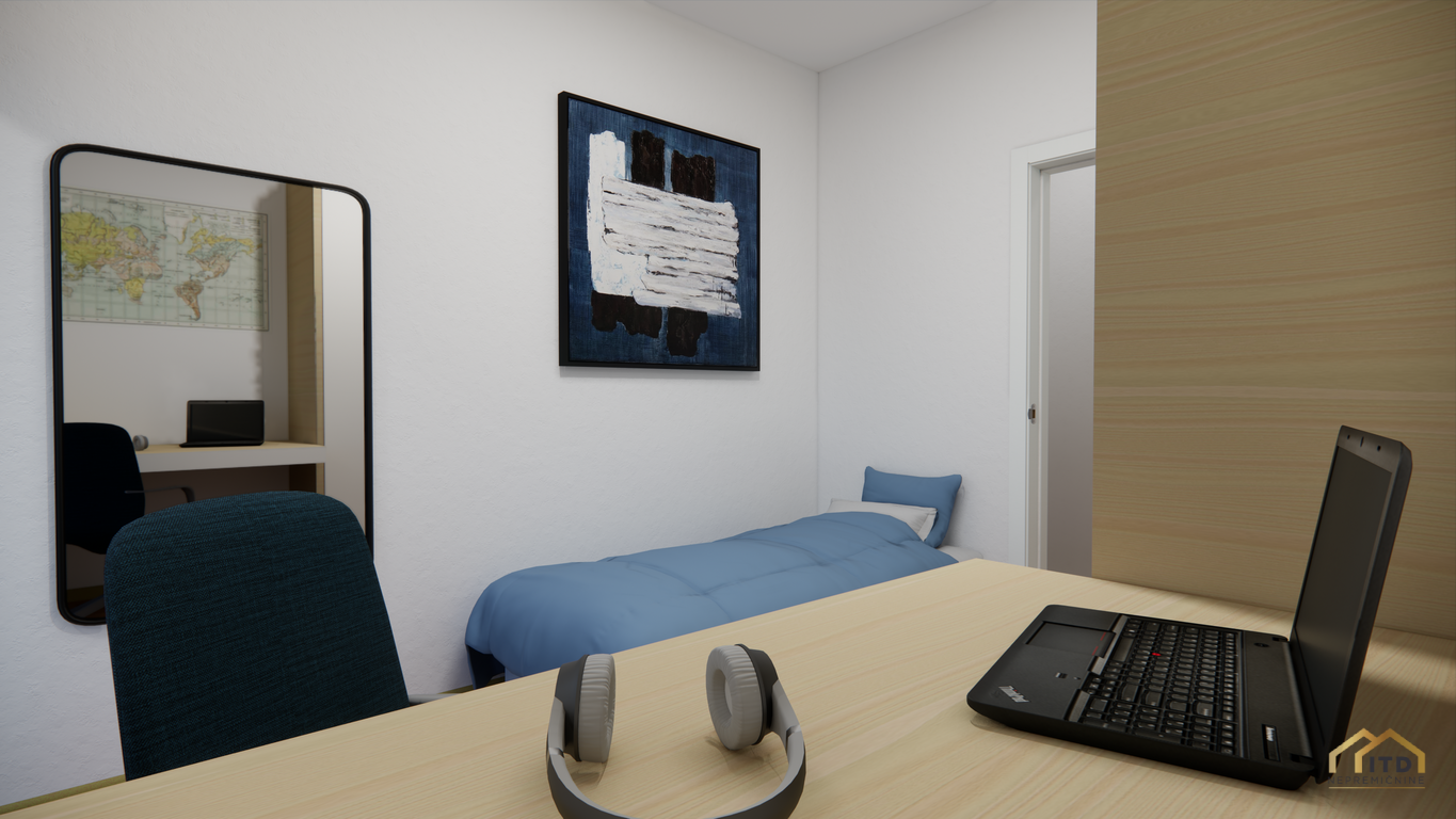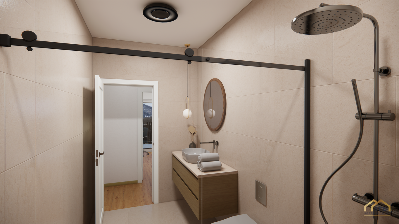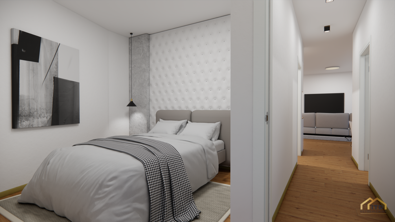 predsoba, ločen wc, prostorom za pralni in sušilni stroj (utility), dnevno-bivalni del s kuhinjo in jedilnico ter izhodom na teraso, spalnica, 2x otroška soba (obe) z izhodom na balkon, kopalnica s tuš kabino. Stanovanje je orientirano na zahod z odprtim pogledom na Šmarjetno goro in okolico.
