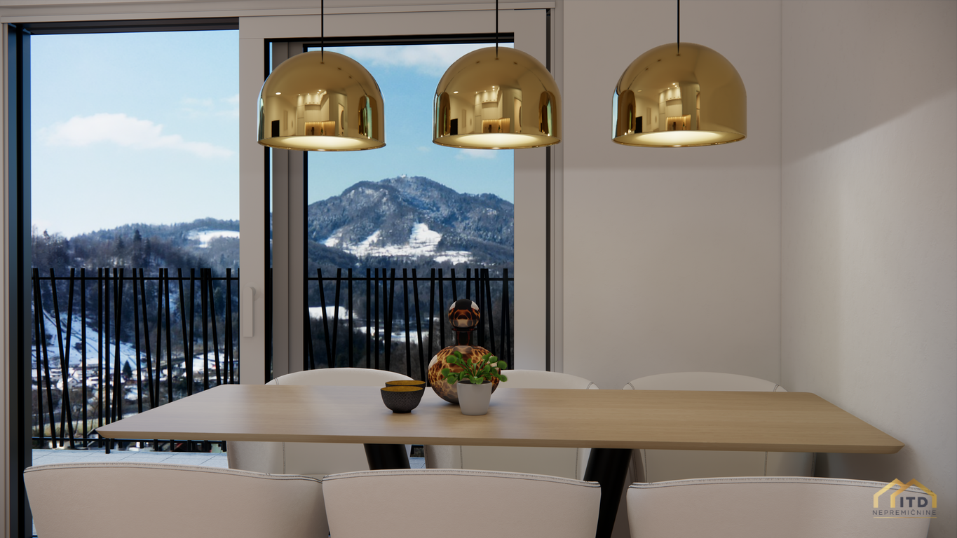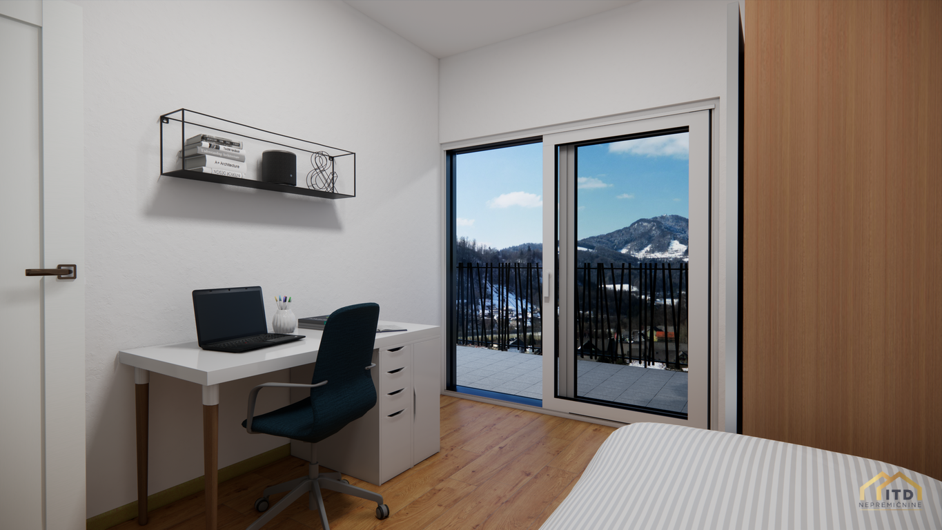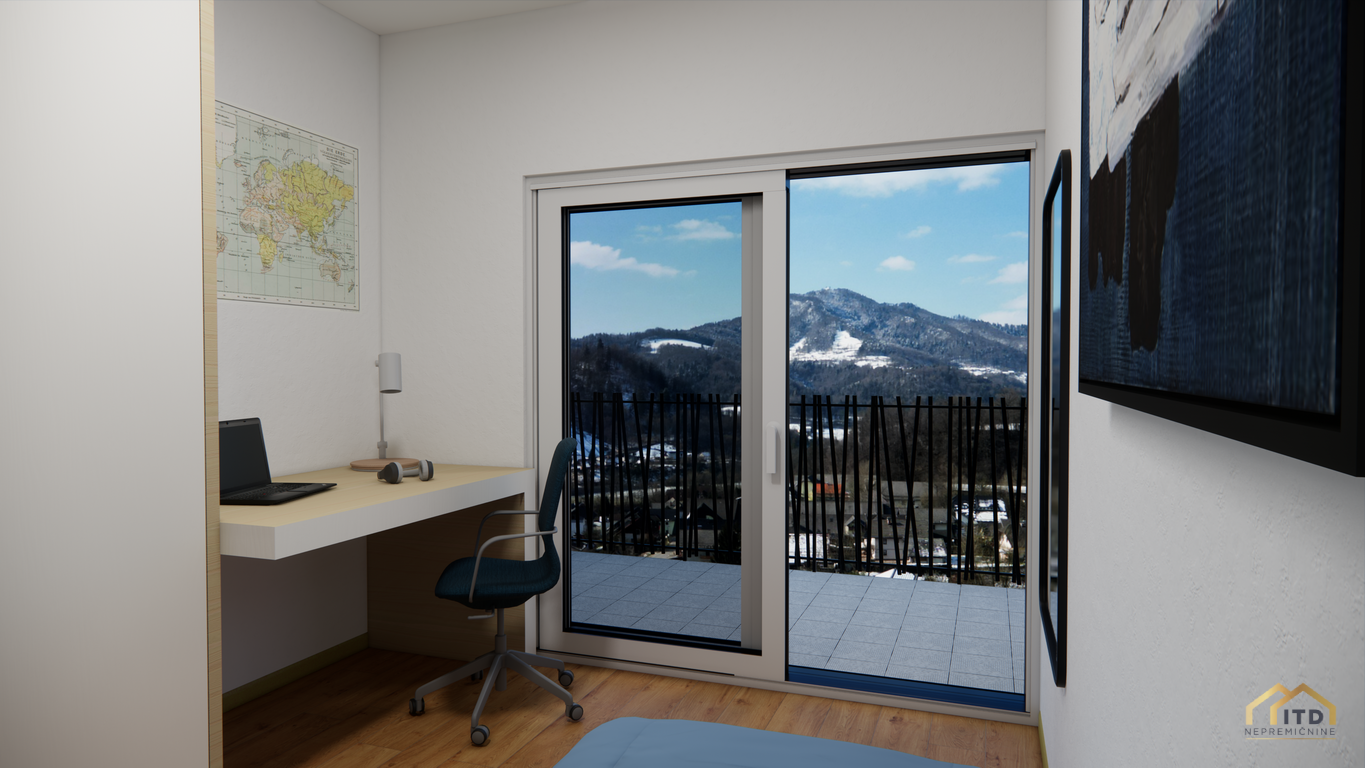 predsoba, ločen wc, prostorom za pralni in sušilni stroj (utility), dnevno-bivalni del s kuhinjo in jedilnico ter izhodom na teraso, spalnica, 2x otroška soba (obe) z izhodom na balkon, kopalnica s tuš kabino. Stanovanje je orientirano na zahod z odprtim pogledom na Šmarjetno goro in okolico.