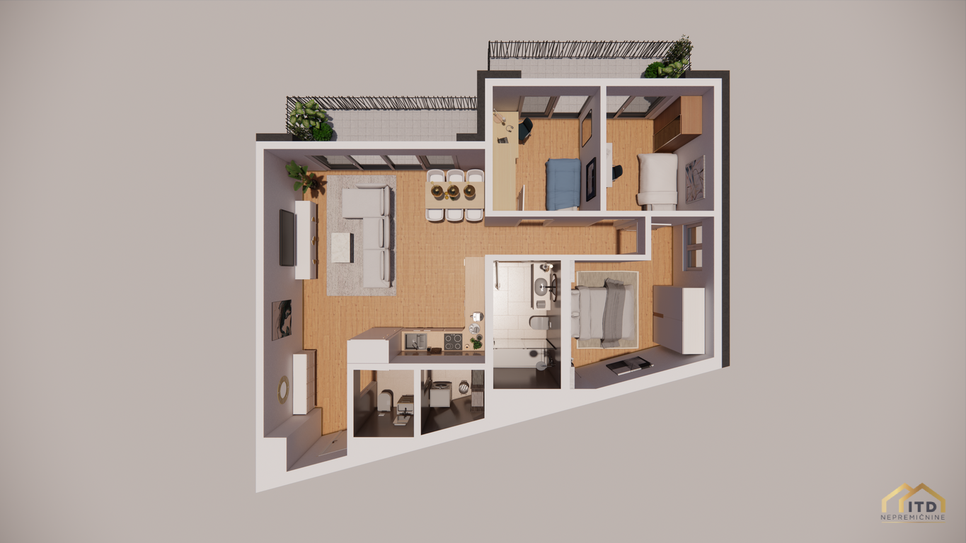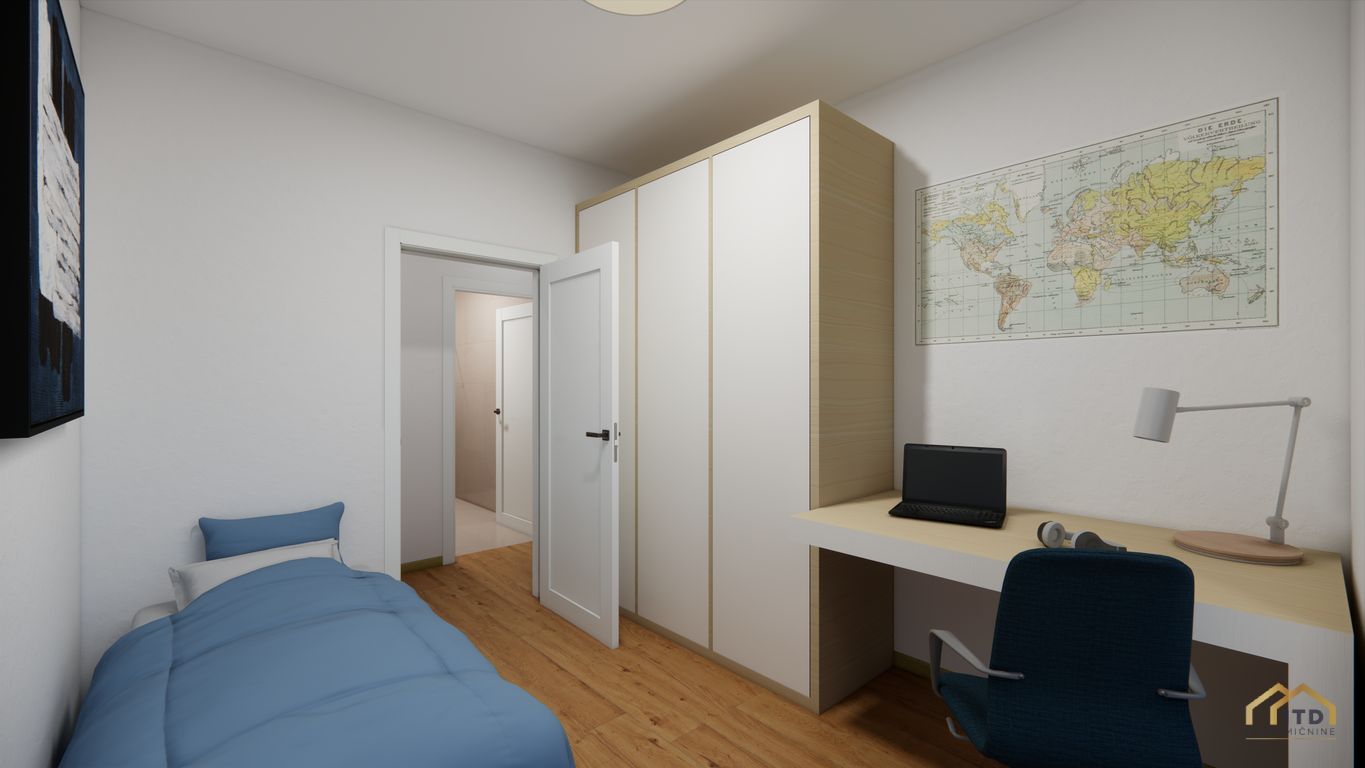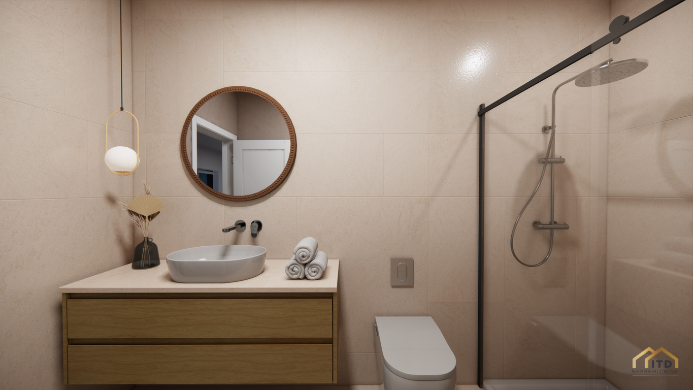 predsoba, ločen wc, prostorom za pralni in sušilni stroj (utility), dnevno-bivalni del s kuhinjo in jedilnico ter izhodom na teraso, spalnica, 2x otroška soba (obe) z izhodom na balkon, kopalnica s tuš kabino. Stanovanje je orientirano na zahod z odprtim pogledom na Šmarjetno goro in okolico.