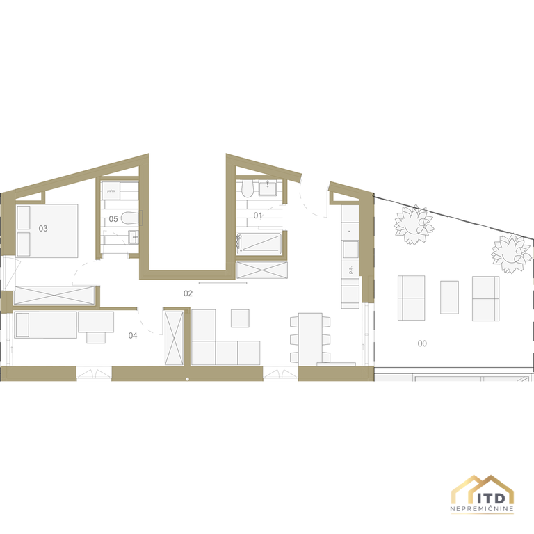 dnevno-bivalni del s kuhinjo in jedilnico (28,97 m2) ter izhodom na teraso-atrij, spalnica 10,45 m2, otroška soba 11,02 m2, 2 kopalnici (4,05 m2 in 3,20 m2).